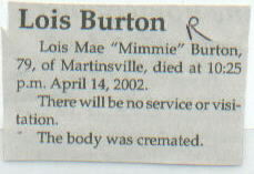 | Other | Age 79. No service or visitation. The body was cremated. |