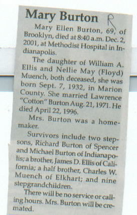 | Survived By | Two stepsons, Richard and Michael Burton; brother, James D. Ellis; half-brother, Charles W. Muench; 9 step-grandchildren. |