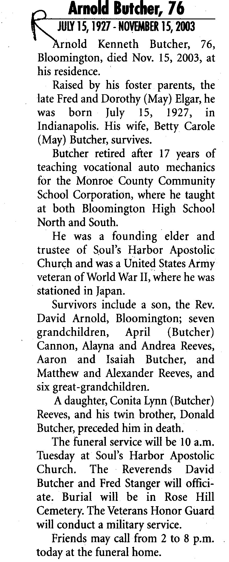 | Survived By | Wife; son, Rev. David Arnold; 7 grandchildren; 6 great-grandchildren. |