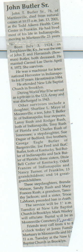 | Other | Preceded in death by parents, John T. and Havanna (Bowman) Butler; sister, Trixie LaMonet; 3 stepdaughters; grandson, Timothy Jackson. U.S. Army veteran, WW II. |