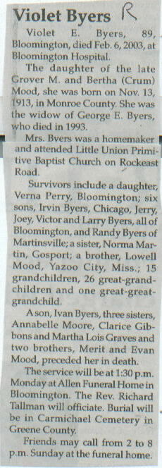 Other Preceded in death by a son, Ivan Byers, three sisters, Annabelle Moore, Clarice Gibbons, and Martha Lois Graves, and two brothers, Merit and Evan Mood.