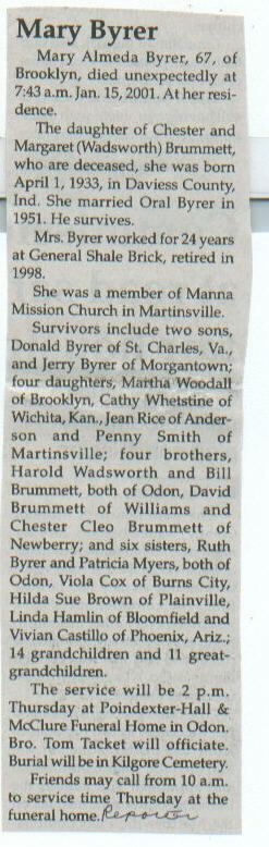 | Survived By | Spouse; sons, Donald and Jerry Byrer; daughters, Martha Woodall, Cathy Whetstine, Jean Rice, and Penny Smith; brothers, Harold Wadsworth, Bill, David, and Chester Cleo Brummett; sisters, Ruby Byrer, Patricia Myers, Viola Cox, Hilda Sue Brown, Linda Hamlin, and Vivian Castillo. |