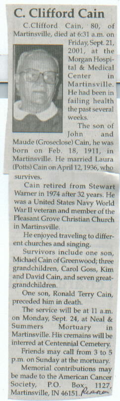 | Other | Preceded in death by parents, John and Maude (Groseclose) Cain; son, Ronald Terry Cain. |