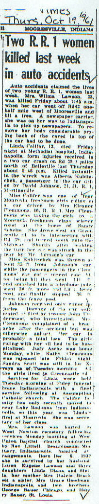 | Other | Died in an auto accident near Belleville. Foley Funeral Home, Indianapolis and Assumption Catholic Church there. Had recently moved to Lake Bodonna from Indianapolis. Freshman in HS. |