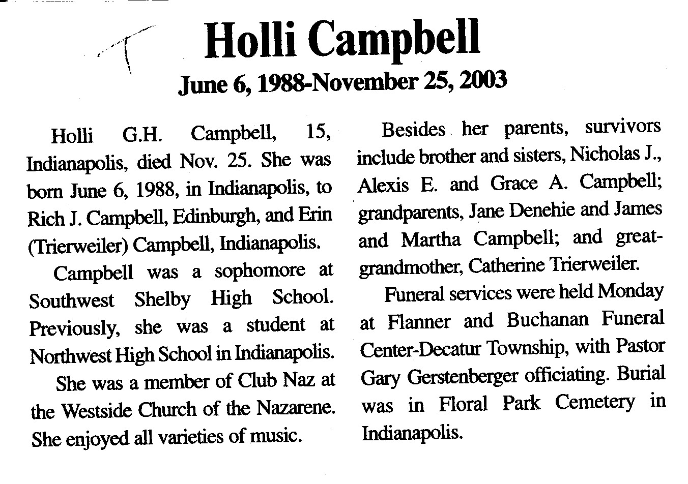| Survived By | Parents, Rich J. and Erin (Trierweiler) Campbell; brother and sisters, Nicholas J., Alexis E., and Grace A. Campbell; grandparents, Jane Denehie, and James and Martha Campbell; great-grandmother, Catherine Trierweiler. |