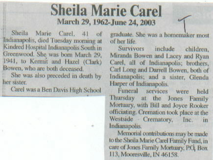 Survived By Children, Miranda Bowen, and Lacey and Ryan Carel; brothers, Carl Long and Darrell Bowen; sister, Glenda Harper.