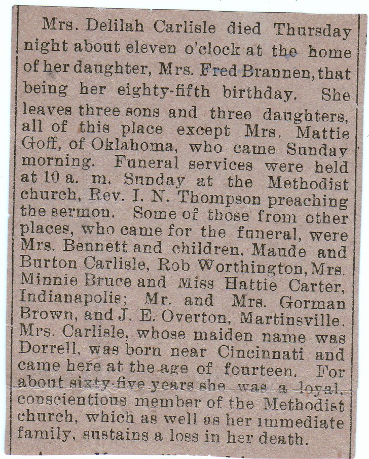 | Other | From Mooresville -- Mrs. Delilah (Dorrell) Carlisle died Thursday at the home of her daughter, Mrs. Fred Brannen, age 85. She was born near Cincinnati, Ohio and came here at age 14. Parents: Redman and Elizabeth Dorrell. "Moved to Morgan County with her parents as a child, and later to Missouri. At age 14, she came to Mooresville and made her home with Samuel Moore for 6 years." Buried in Carlisle family plot, Mooresville Cemetery. |