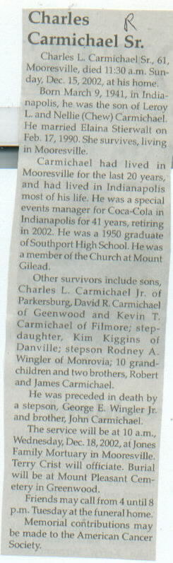 | Survived By | Widow; sons, Charles L., Jr., David R., and Kevin T. Carmichael; stepdaughter, Kim Kiggins; stepson, Rodney A. Wingler; 10 grandchildren; 2 brothers, Robert and James Carmichael. |