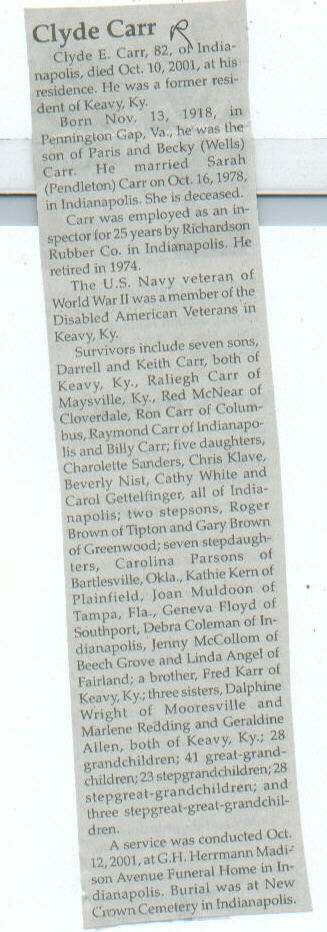 | Other | Preceded in death by spouse, and parents, Paris and Becky (Wells) Carr. U.S. Navy veteran, World War II. |