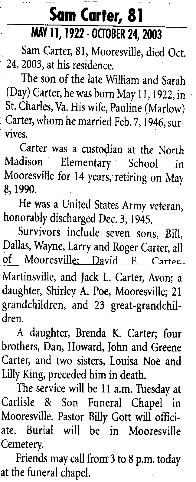 Survived By Wife; 7 sons, Bill, Dallas, Wayne, Larry, Roger, David E., and Jack L. Carter; daughter, Shirley A. Poe; 21 grandchildren; 23 great-grandchildren.