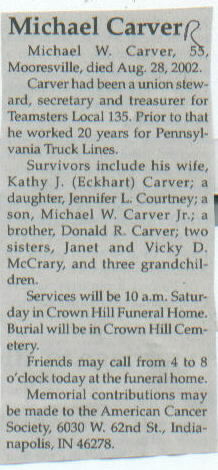 Survived By Widow; daughter, Jennifer L. Courtney; son, Michael W. Carver, Jr.; brother, Donald R. Carver; 2 sisters, Janet and Vicky D. McCrary; 3 grandchildren.