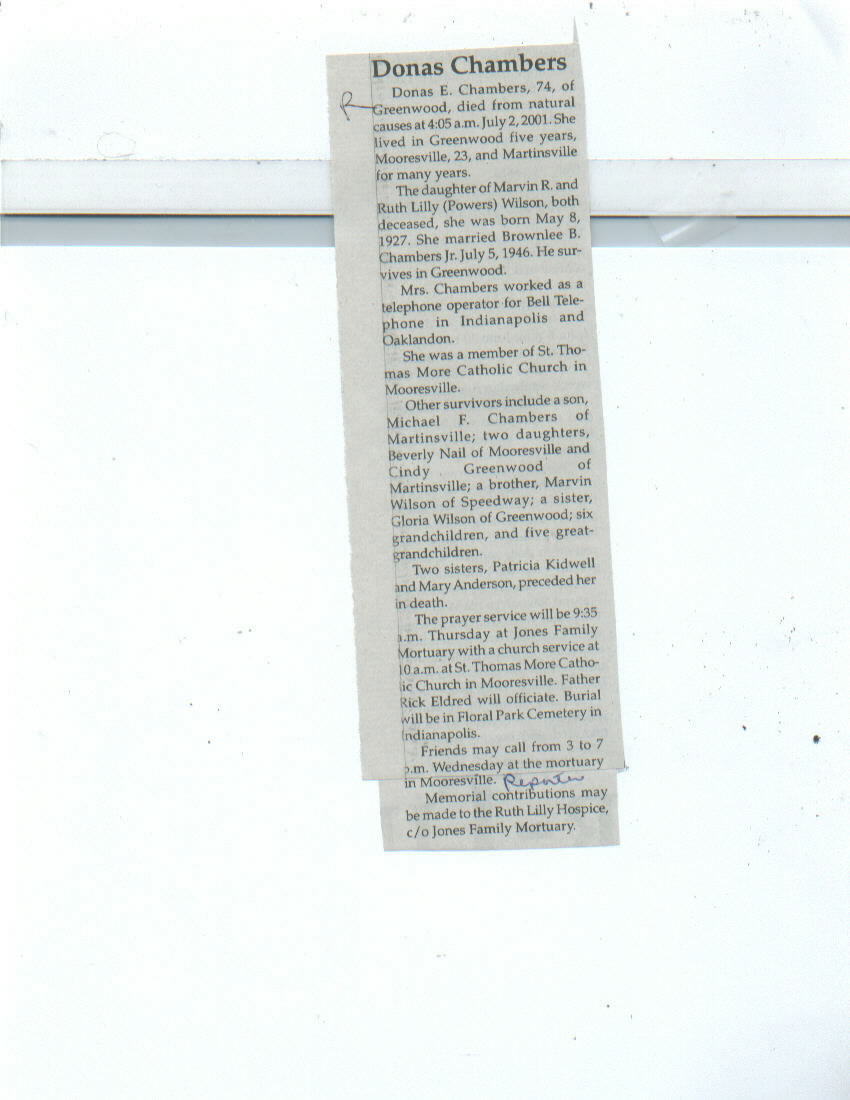 | Survived By | Spouse; son, Michael F. Chambers; daughters, Beverly Nail and Cindy Greenwood; brother, Marvin Wilson; sister, Gloria Wilson; 6 grandchildren; 5 great-grandchildren. |