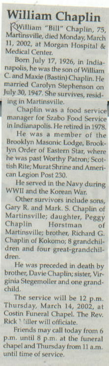| Survived By | Widow; sons, Gary R. and Mark S. Chaplin; daughter, Peggy Chaplin Horstman; brother, Richard G. Chaplin; 8 grandchildren; 4 great-grandchildren. |