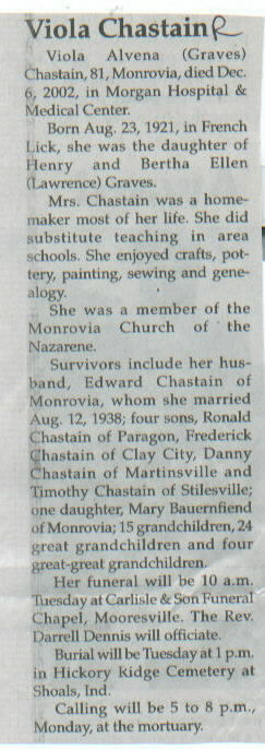 | Survived By | Spouse; 4 sons, Ronald, Frederick, Danny, and Timothy Chastain; daughter, Mary Bauernfiend; 15 grandchildren; 24 great-grandchildren; 4 great-great-grandchildren. |