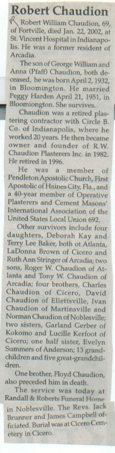 Survived By Widow; 4 daughters, Deborah Kay, Terry Lee Baker, LaDonna Brown, and Ruth Ann Stringer; 2 sons, Roger W. and Tony W. Chaudion; 4 brothers, Charles, David, Ivan, and Norman Chaudion; 2 sisters, Garland Gerber and Lucille Kerfoot; half sister, Evelyn Summers; 13 grandchildren; 5 great-grandchildren.
