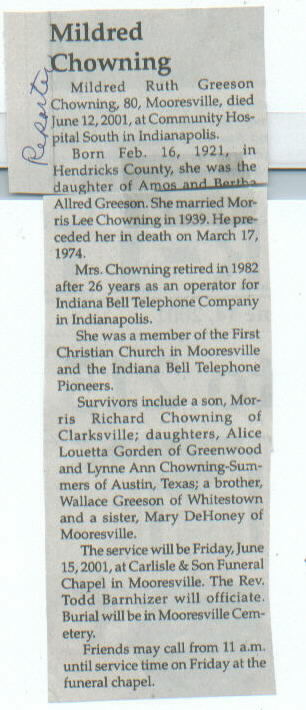 | Survived By | Son, Morris Richard Chowning; daughters, Alice Louetta Gorden and Lynne Ann Chowning-Summers; brother, Wallace Greeson; sister, Mary DeHoney. |