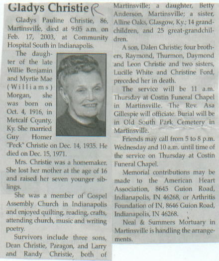 Survived By Three sons, Dean, Larry, and Randy Christie; daughter, Betty Anderson; sister, Alline Oaks; 14 grandchildren; 25 great-grandchildren.
