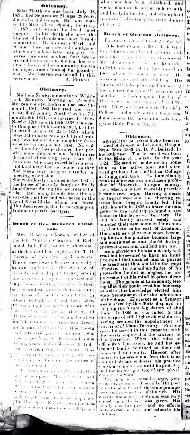 | Other | Age 70 years and 16 days. Widow of William Clawson of Richmond, Ind. Mother of Martha J., Mary Emma and Alice. Died at the home of her nephew, Dr. T. B. Harvey. |