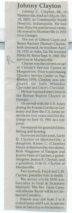 Other Preceded in death by parents, Gilford Cayce and Bessie Rachael (Tanner) Clayton; brothers, Floyd and C. H. Clayton. Served with U.S. Army.