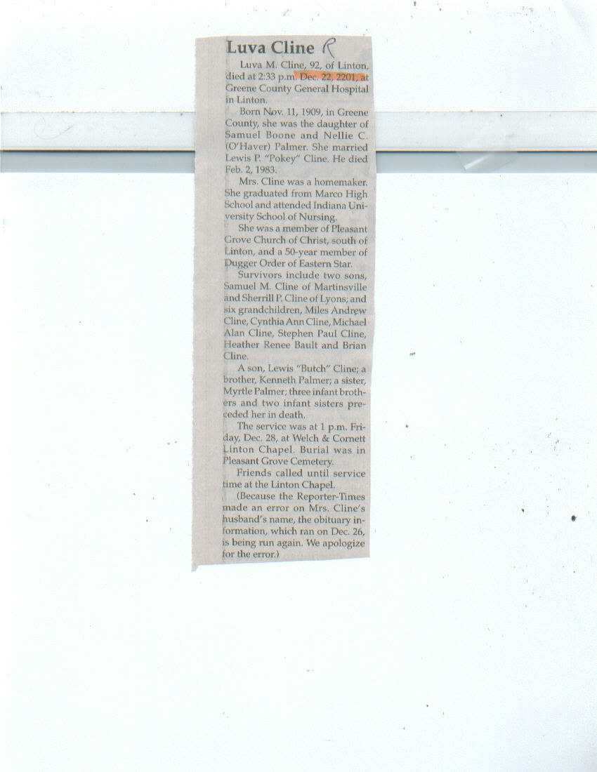 | Other | Preceded in death by parents, Samuel Boone and Nellie C. (O Haver) Palmer; spouse; son, Lewis Cline; brother, Kenneth Palmer; sister, Myrtle Palmer; 3 infant brothers and 2 infant sisters. |