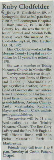 | Survived By | Two daughters, Mary Ann Ennis and Rachel J. Martindale; brother, Samuel Goad; 2 sisters, Irene Henderson and Hazel Estes; 4 grandchildren, Ardena Chaney, Andy Martindale, Rachann Mayer, and Rosann Clark; 6 great-grandchildren. |