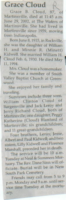 | Survived By | Three sons, William Clinton, Jack Leroy, and Jerry Richard Cloud; daughter, Peggy Katherine (Cloud) Blanford; 6 grandchildren; 11 great-grandchildren. |