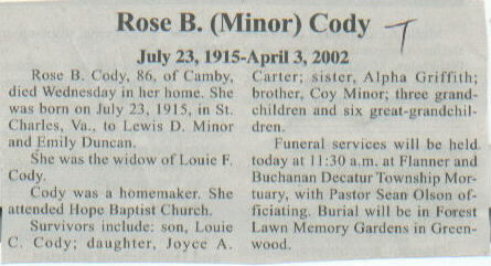 | Survived By | Son, Louie C. Cody; daughter, Joyce A. Carter; sister, Alpha Griffith; brother, Coy Minor; 3 grandchildren; 6 great-grandchildren. |