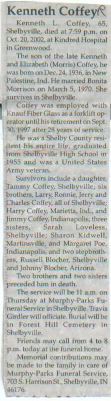 | Survived By | Widow; daughter, Tammy Coffey; 6 brothers, Larry, Ronnie, Jerry, Charles, Harry, and Jimmy Coffey; 3 sisters, Sarah Loveless, Sharon Kidwell, and Margaret Poe; 2 stepbrothers, Russell and Johnny Blocher. |