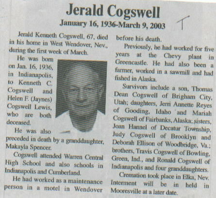 Survived By Son, Thomas Dean Cogswell; daughters, Jerri Annette Reyes and Mariah Cogswell; sisters, Joan Hannel, Judy Cogswell, and Deborah Ellison; brothers, Travis and Ronald Cogswell; 4 granddaughters.
