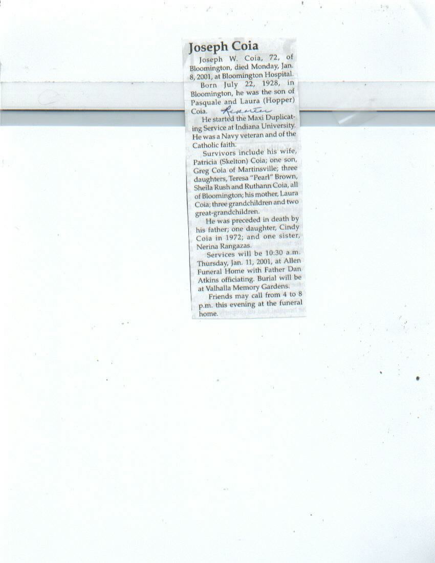 | Survived By | Spouse; mother, Laura (Hopper) Coia; son, Greg Coia; daughters, Teresa Brown, Sheila Rush, and Ruthann Coia; 3 grandchildren; 2 great-grandchildren. |
