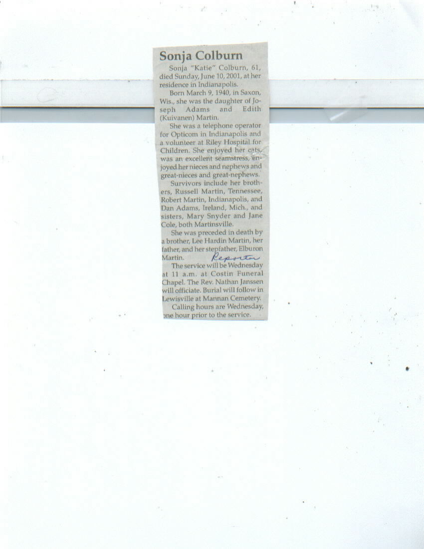 | Other | Preceded in death by brother, Lee Hardin Martin; father, Joseph Adams; stepfather, Elburon Martin. Her mother was Edith (Kuivanen) Martin. |