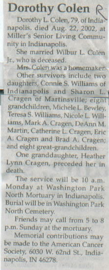 | Survived By | Two daughters, Connie S. Williams and Sharon L. Cragen; 8 grandchildren; 8 great-grandchildren. |