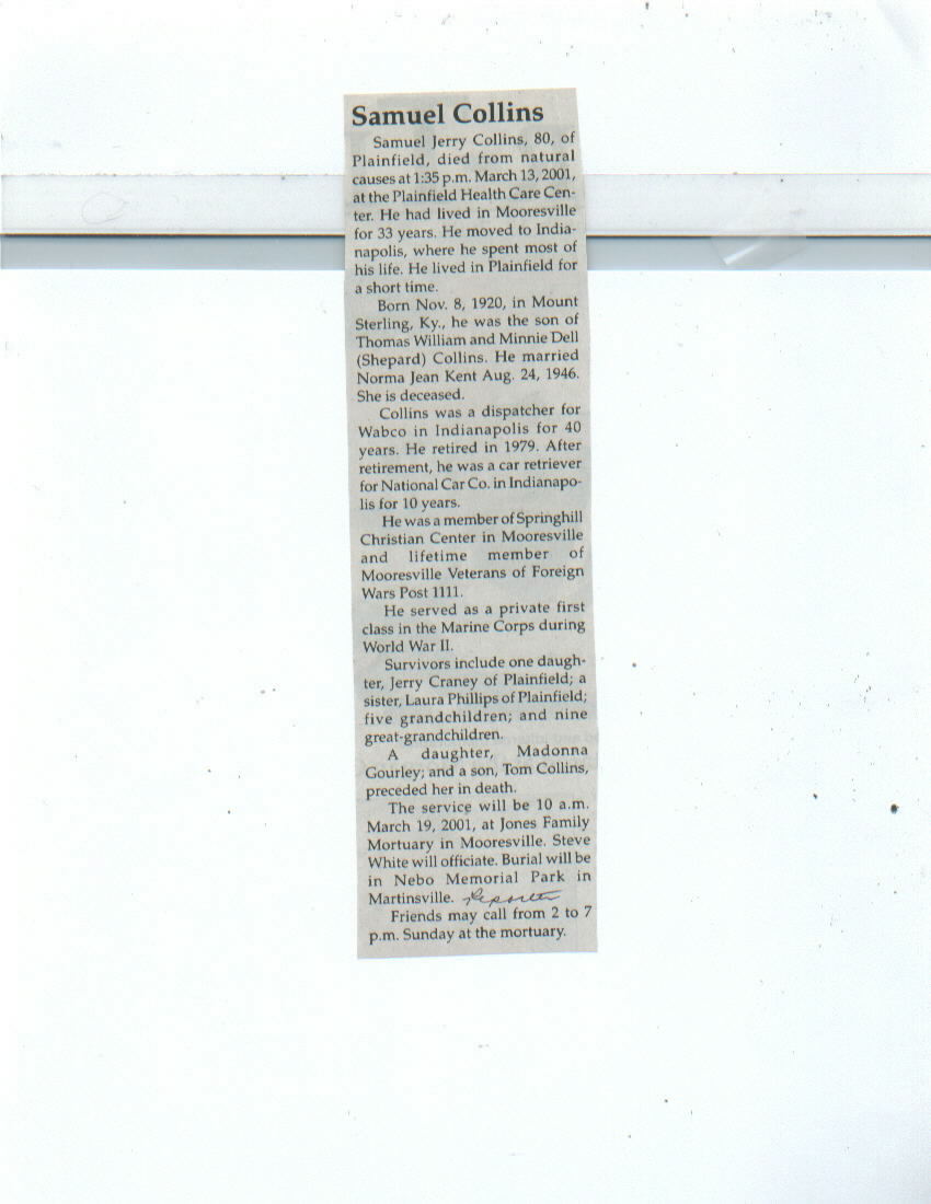 | Other | Preceded in death by parents, Thomas William and Minnie Dell (Shepard) Collins; daughter, Madonna Gourley; son, Tom Collins. Veteran of World War II, US Marine Corps. |