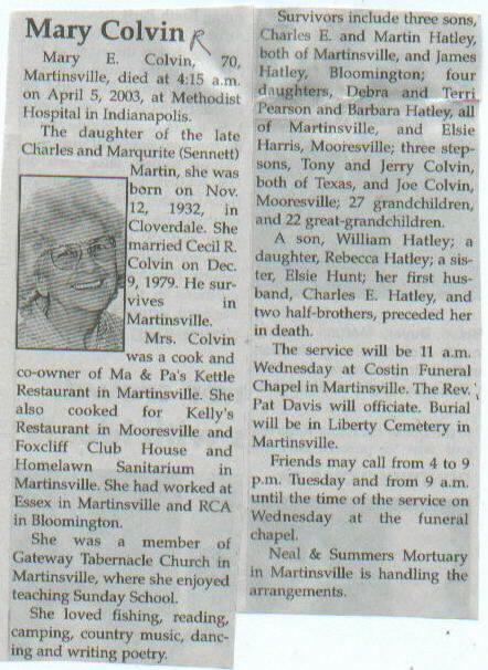 Survived By Spouse; 3 sons, Charles E., Martin, and James Hatley; 4 daughters, Debra and Terri Pearson, Barbara Hatley, and Elsie Harris; 3 stepsons, Tony, Jerry, and Joe Colvin; 27 grandchildren; 22 great-grandchildren.