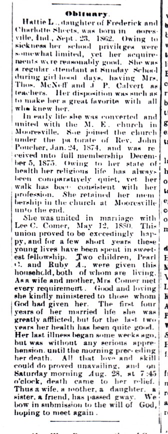 | Other | Age 52. Born in Mooresville, Ind. Parents: Frederick and Charlotte Sheets. Married Levi (Lee) C. Comer on May 12, 1880. Died of typhoid fever in Indianapolis. |