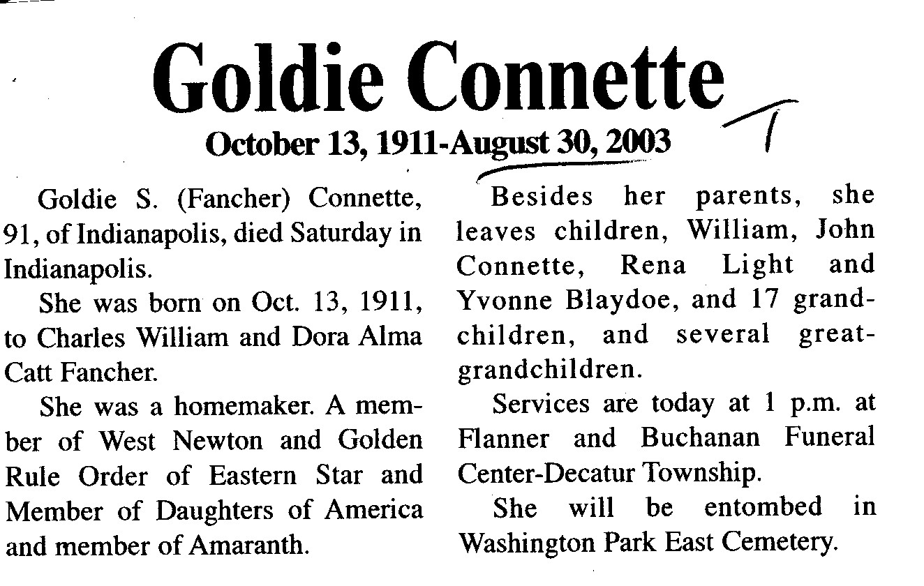 Survived By Parents, Charles William and Dora Alma Catt Fancher; children, William and John Connette, Rena Light, and Yvonne Blaydoe; 17 grandchildren; several great-grandchildren.