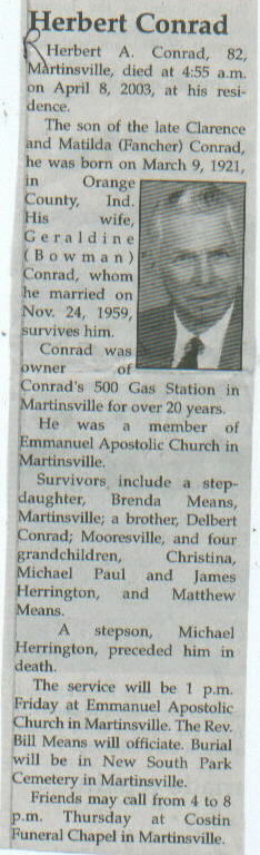 | Survived By | Widow; stepdaughter, Brenda Means; brother, Delbert Conrad; 4 grandchildren, Christina, Michael Paul, James Herrington, and Matthew Means. |