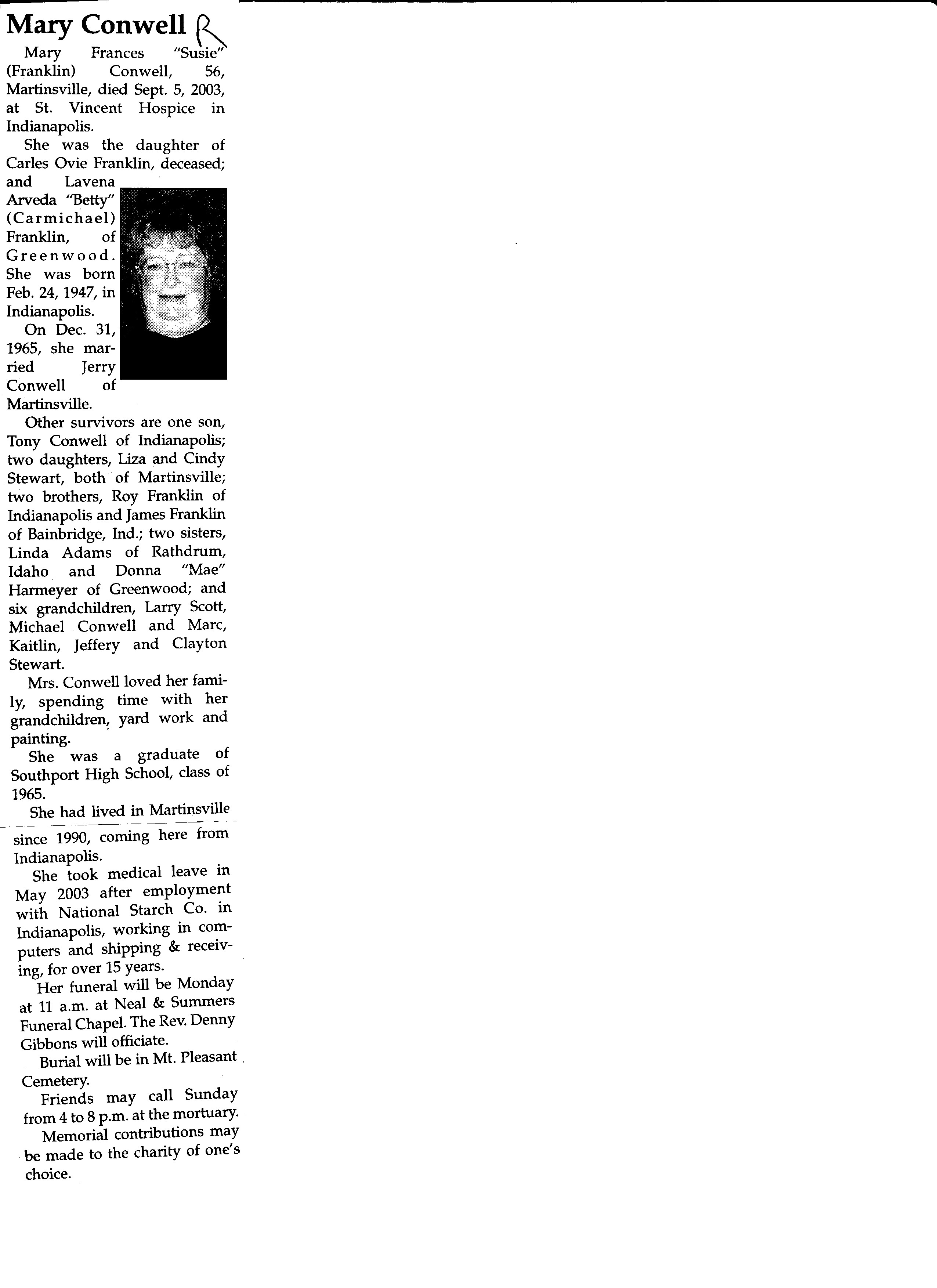 | Survived By | Husband; son, Tony Conwell; 2 daughters, Liza and Cindy Stewart; 2 brothers, Roy and James Franklin; 2 sisters, Linda Adams and Donna "Mae" Harmeyer; 6 grandchildren. |
