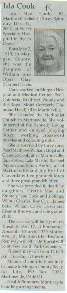 | Survived By | Three sons, Pearl Matthew, William Lloyd, and Clarence Cook; 4 sisters, Lola Martin, Rachael Payton, Sarah Anthis, and Joy Byril; 5 grandchildren; 3 great-grandchildren. |