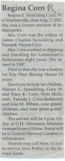 Survived By Children, Warren C. Spaulding, Gary W. and Tracy K. Corn, Vicki McIntosh, Pamela J. Corn-Redmond, and Lisa M. Wilson; 9 grandchildren; 4 great-grandchildren.