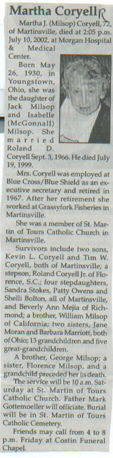 Survived By Two sons, Kevin L. and Tim W. Coryell; stepson, Roland Coryell, Jr.; 4 stepdaughters, Sandra Stokes, Patty Owens, Shelli Bolton, and Beverly Ann Mejia; brother, William Milsop; 2 sisters, Jane Moran and Barbara Marriott; 13 grandchildren; 5 great-grandchildren.