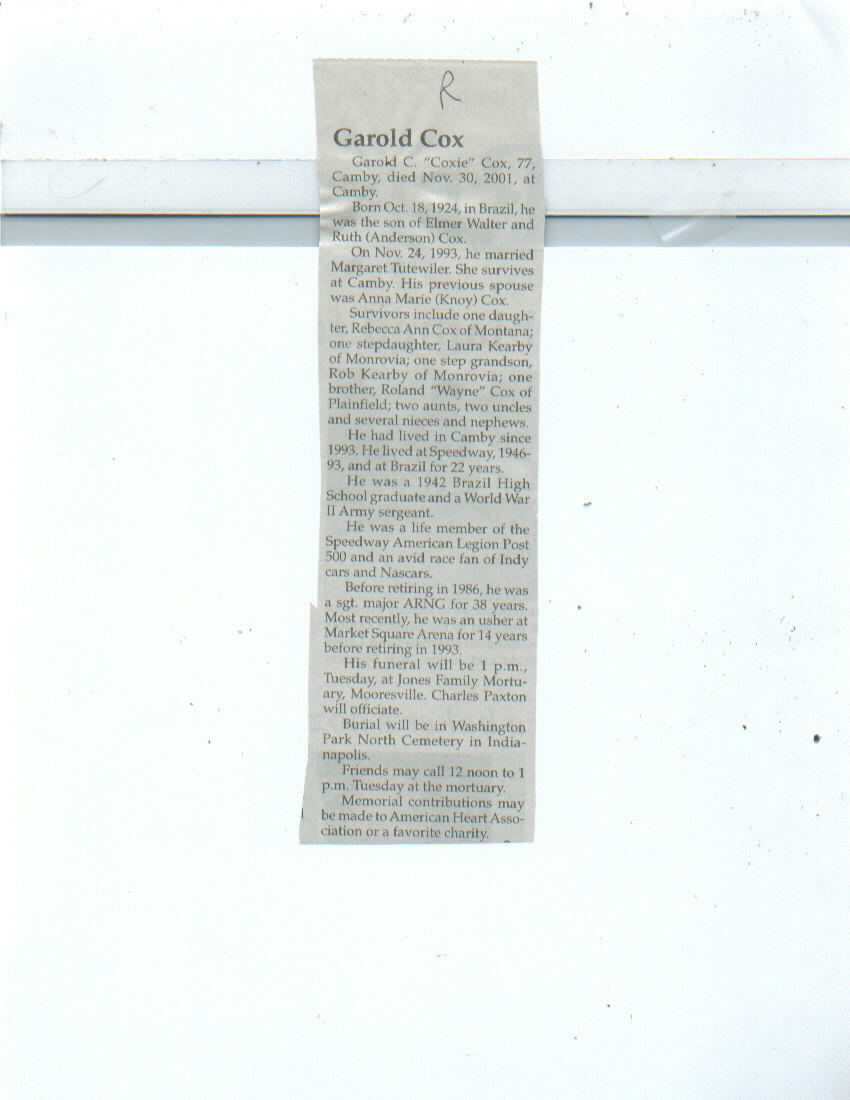 Survived By Spouse, Margaret; daughter, Rebecca Ann Cox; brother, Roland Cox.