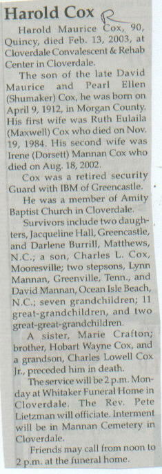 | Survived By | Two daughters, Jacqueline Hall and Darlene Burrill; son, Charles L. Cox; 2 stepsons, Lynn and David Mannan; 7 grandchildren; 11 great-grandchildren; 2 great-great-grandchildren. |