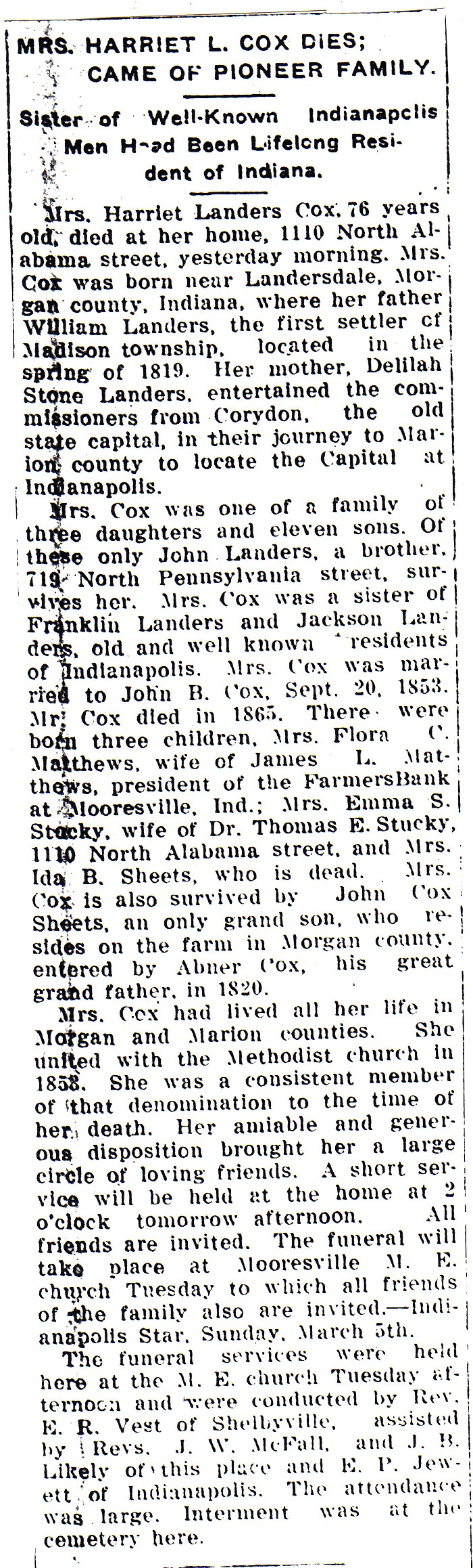 | Other | Age 75. Born in Landersville, Morgan Co., Ind.; daughter of William and Delilah Stone Landers. Married on Sept. 20, 1853 in Morgan Co. Mother of Florence C., Emma S., and Ida B. Cox. After her husband died, her older brother, Franklin Landers, built a house for her at the corner of Indiana and Washington Streets in Mooresville. |