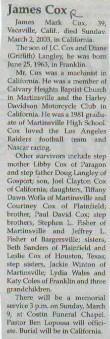 | Survived By | Parents, J.C. Cox and Diane (Griffith) Langley; stepmother, Libby Cox; stepfather, Doug Langley; son, Joel Clayton Cox; daughters, Tiffany Dawn Wofla and Courtney Cox; brother, Paul David Cox; stepbrothers, Stephen L. and Jeffrey L. Fisher; sisters, Beth Sanders and Leslie Cox; stepsisters, Jackie Winton, Lydia Wales, and Katy Coles; 3 grandchildren. |