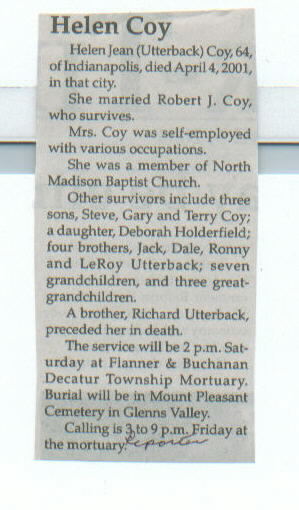 Survived By Spouse; sons, Steve, Gary, and Terry Coy; daughter, Deborah Holderfield; brothers, Jack, Dale, Ronny, and LeRoy Utterback; 7 grandchildren; 3 great-grandchildren.
