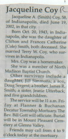 | Survived By | Spouse; daughter, Jill Simmons; son, Doug Sergent; brother, James R. Smith; sister, Jeanie Utterback; 5 grandchildren. |