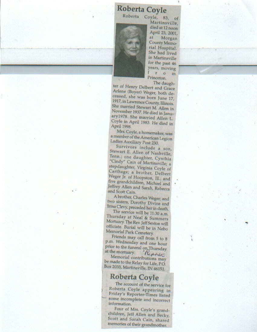 | Other | Preceded in death by both spouses; parents, Henry Delbert and Grace Arlene (Boyer) Weger; brother, Charles Weger; sisters, Dorothy Divine and Irma Clevy. |