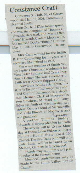 | Survived By | Spouse; daughter, Jina Craft Taylor; son, Fred Craft; brothers, Michael and Tony Edwards; sisters, Donna Cloud and Vicki Elmore; 1 grandson; mother, Marie Ellen (Soots) Edwards Clark. |