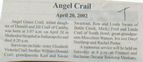 | Survived By | Parents, Donald and Jill Crail; sister, Elizabeth Victoria Crail; brother, William Donald Crail; grandparents, Karl and Susan Swartout, Ron and Linda Swain, and Fred and Linda Crail; great-grandparents, Marcelene Watson, Iris and Daryl Northrop, and Rachel Porter. |